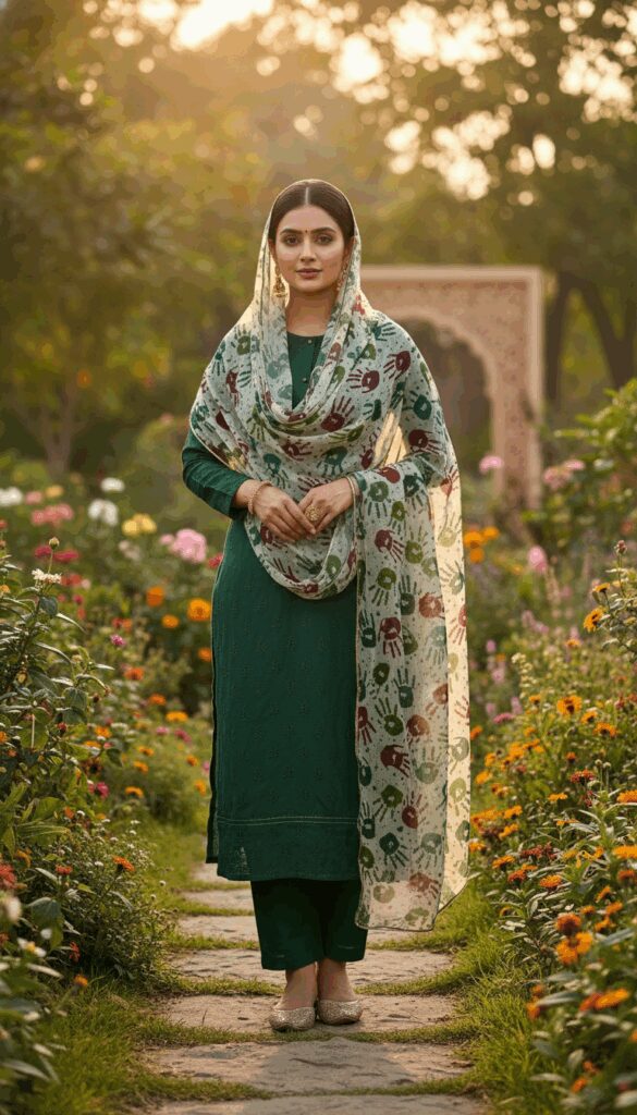 Gogi Collection Green Silk Suit with Contrast Printed Pure Dupatta – Elegant & Stylish