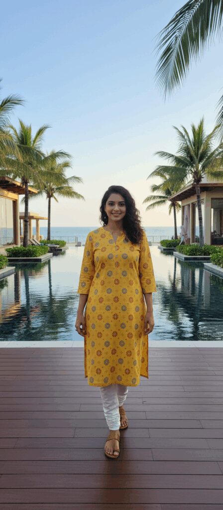 Dhuni by Avaasa Mustard Yellow Printed Rayon Kurti: Elegant Three-Quarter Sleeve Ethnic Top for Comfortable Everyday Wear by Gogi Collection