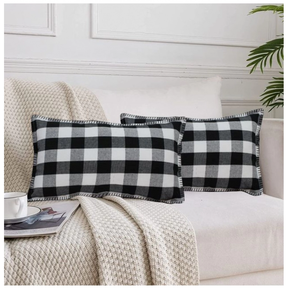 Generic Pack Of_2 Cotton Checkered Cushion Cover With Blanket Stitch (Black, Size:Â 12×20 In)