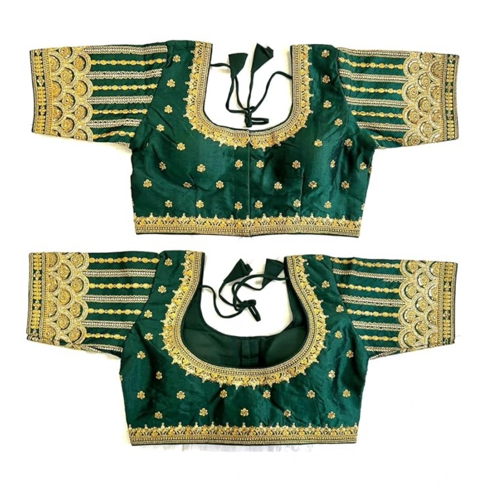 Generic Women’s Phantom Silk Embroidery Round Neck Short Sleeve Readymade Blouse (Dark Green, Free Size)