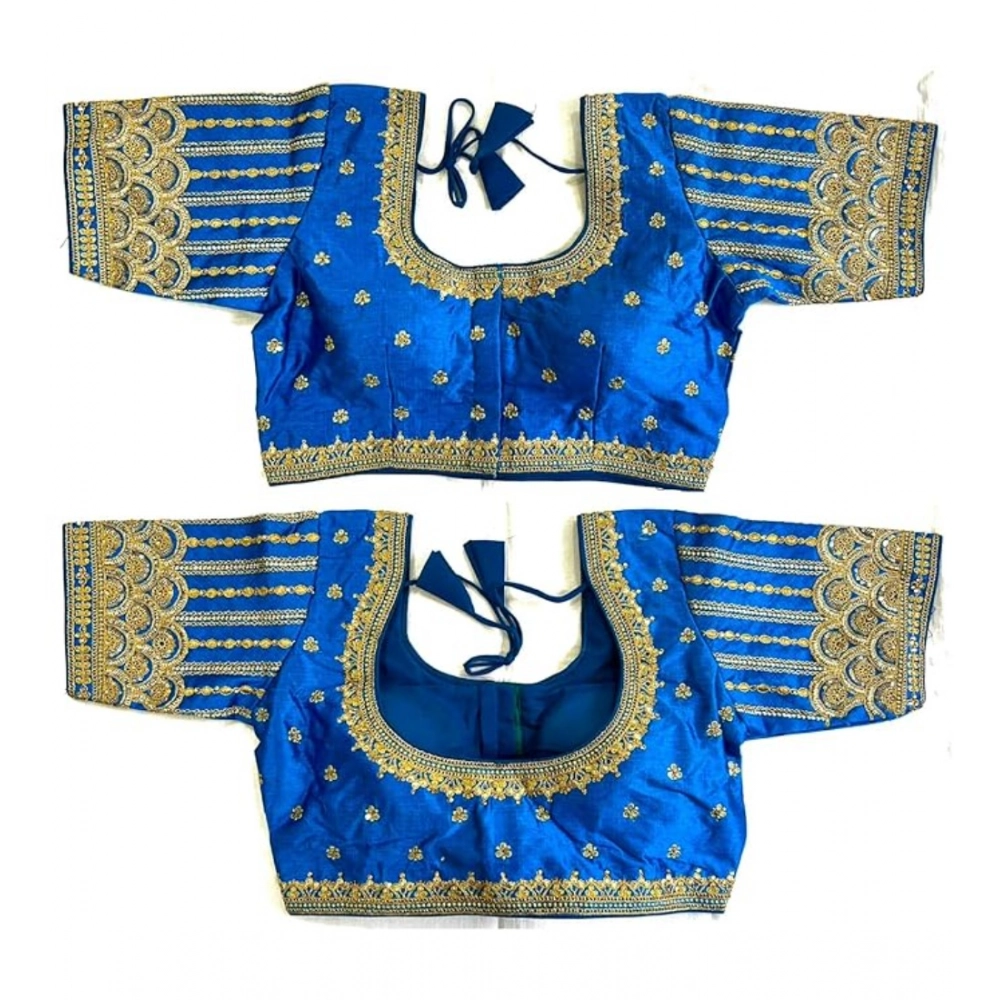 Generic Women’s Phantom Silk Embroidery Round Neck Short Sleeve Readymade Blouse (Royal Blue, Free Size)
