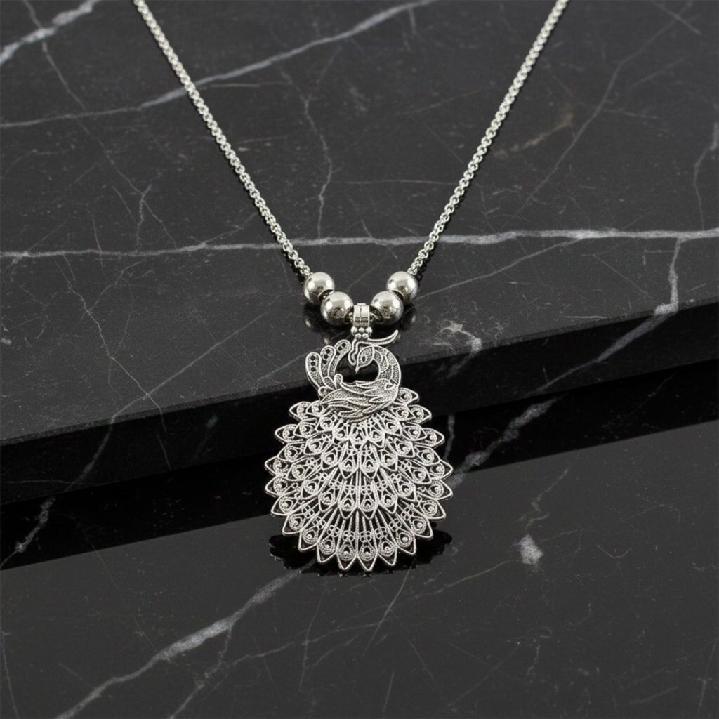 Elegant Peacock Design Oxidised Silver Finish Pendant Necklace (1 Pc)