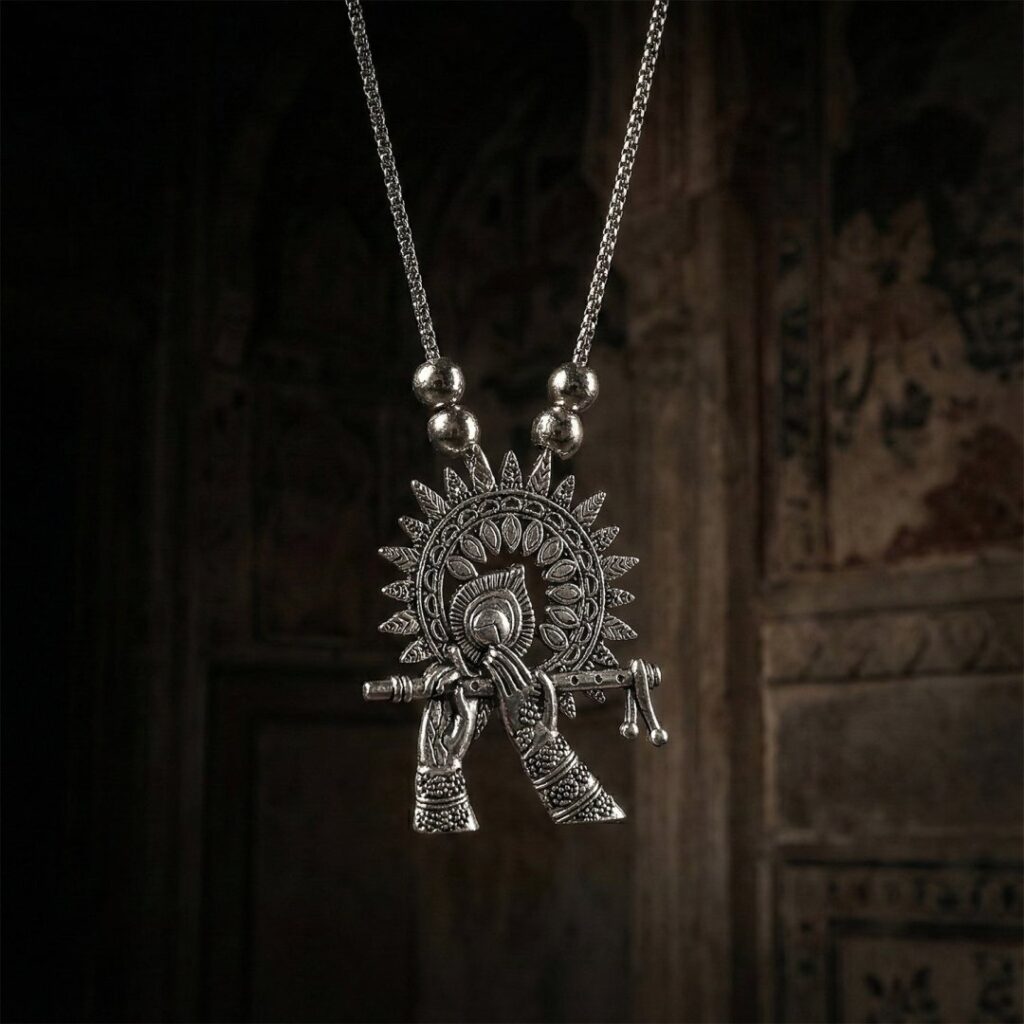 Oxidised Silver Finish Krishna Flute Pendant Necklace (1 Pc)