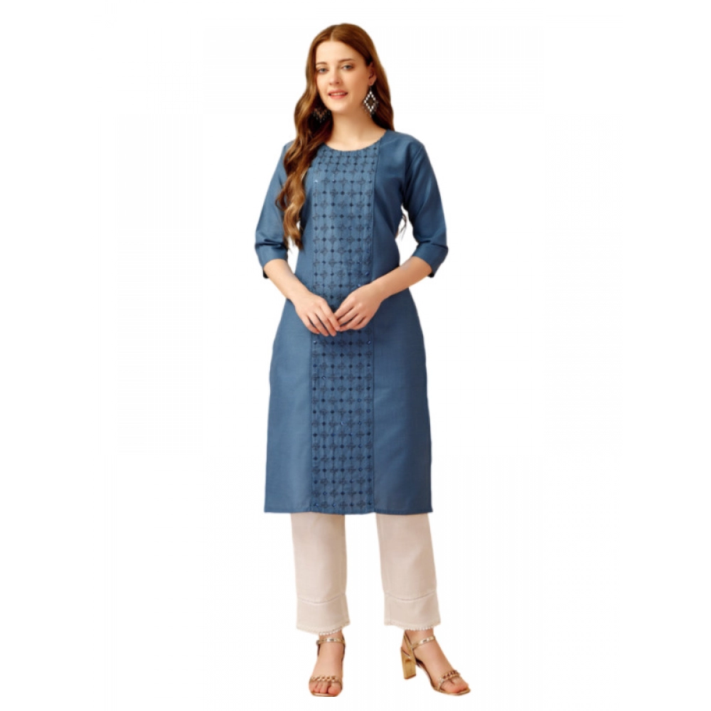 Generic Women’s Casual 3-4 th Sleeve Embroidery Cotton Kurti Pant Set (Light Blue)