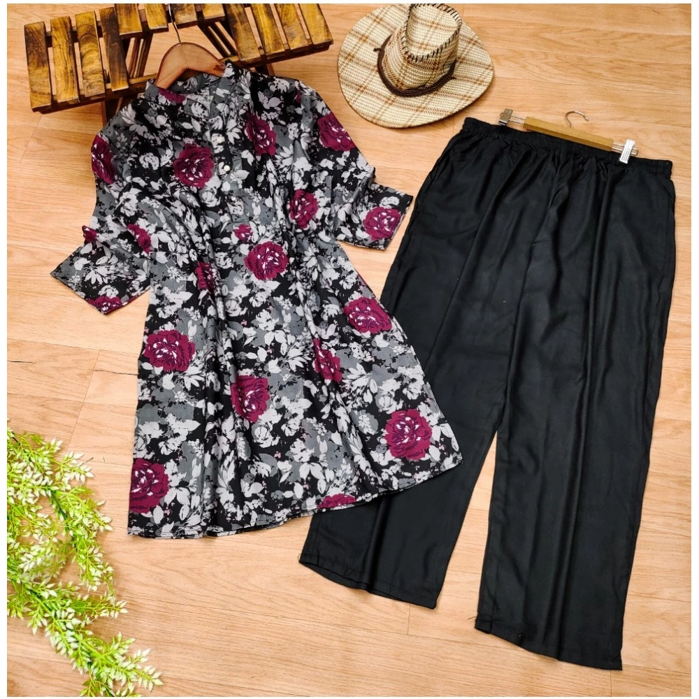 Generic Women’s Rayon Printed Round Neck Kurti with Pant and Dupatta Set (Black)