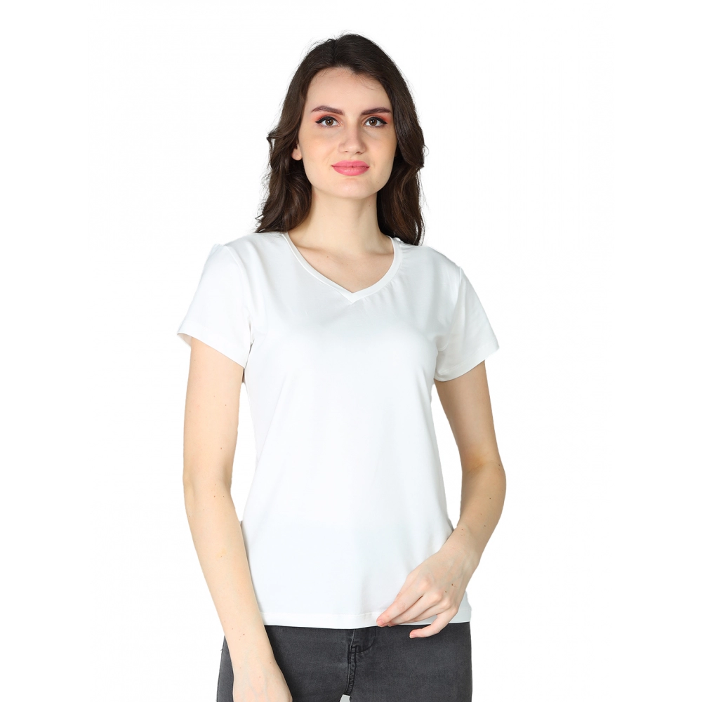 Generic Women’s Cotton Solid Closure Neck Half Sleeve T-Shirt (Off_White)