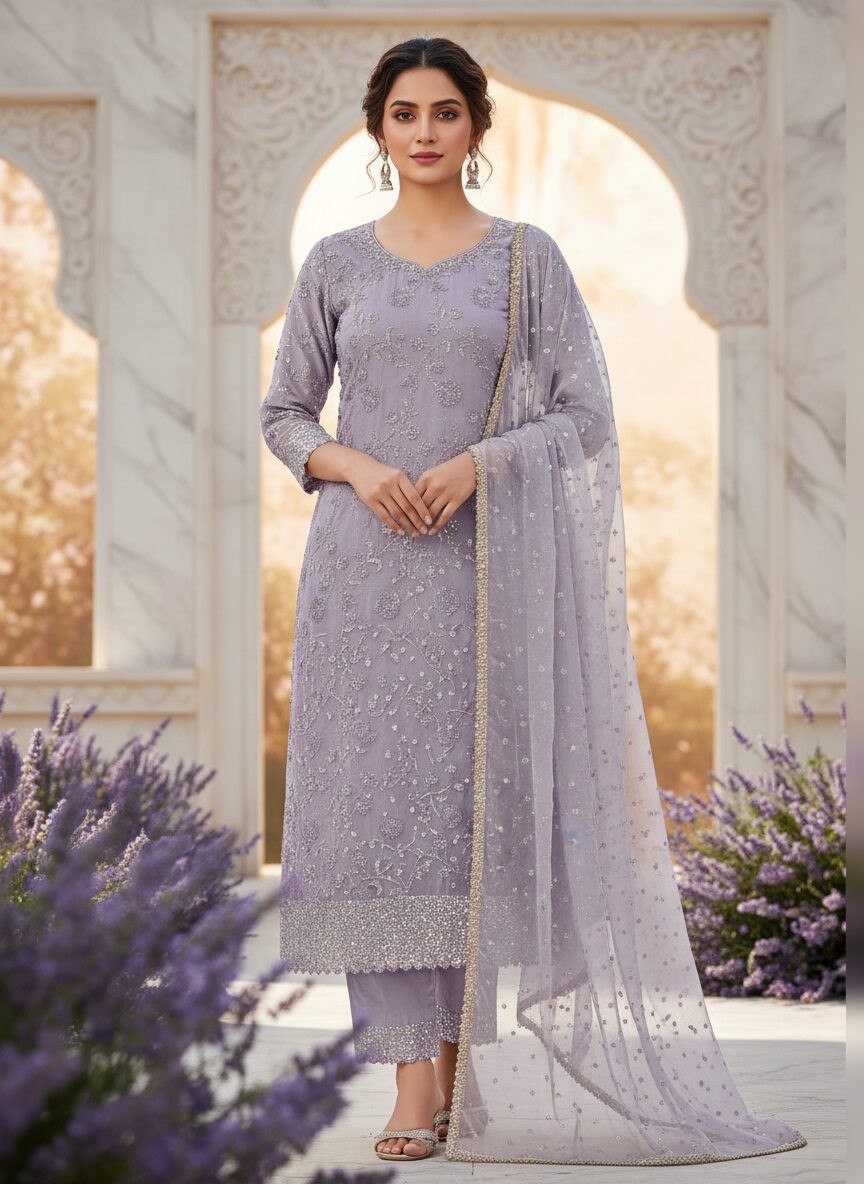 Embrace elegance with this breathtaking lavender organza handwork suit. 🌸