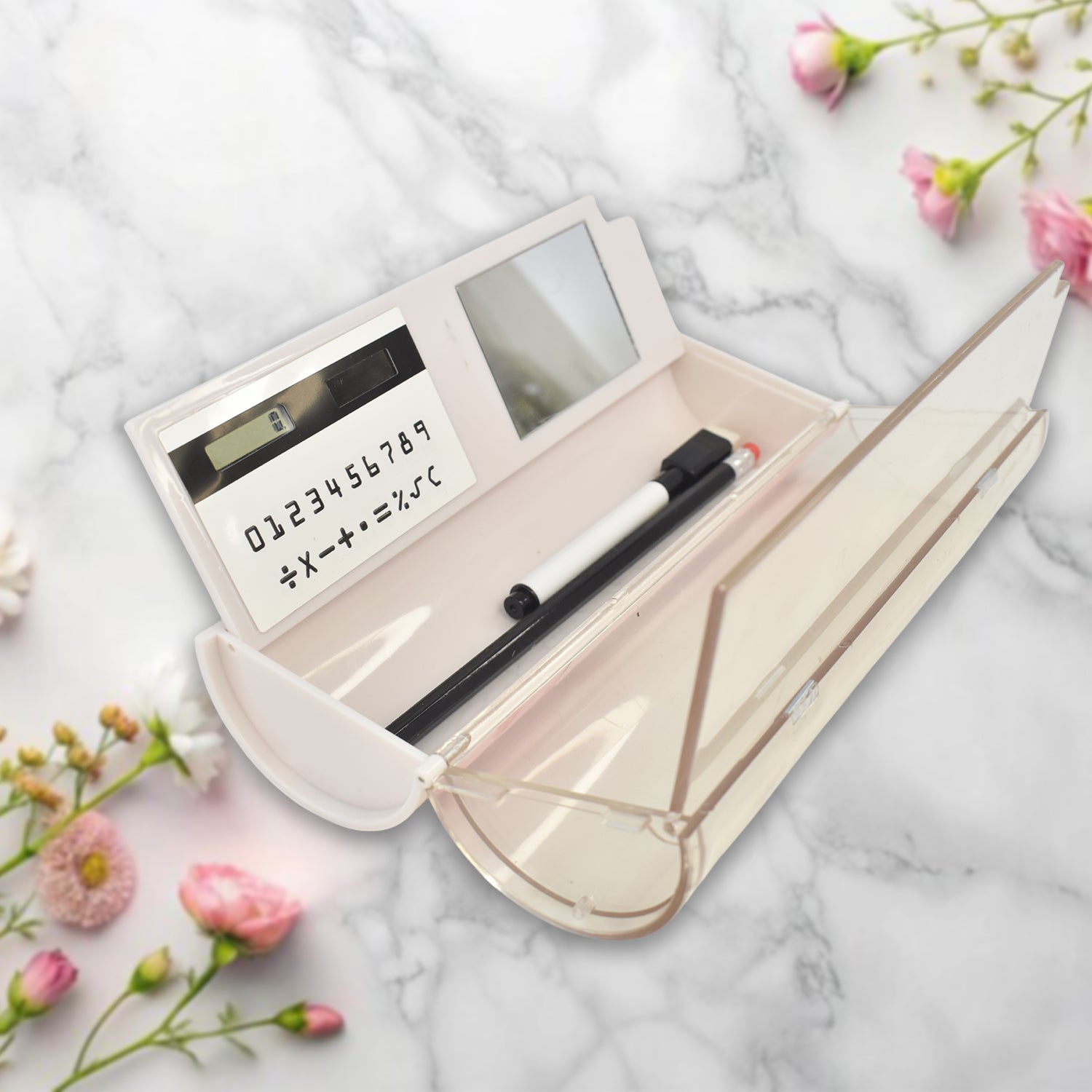 6 in 1 Compass Box, Geometry Box 2 Compartment, Pencil Box with 1 Calculator, 1 Mirror, 2 in 1 Marker Pen With Eraser for Boys Art Plastic Pencil Box for Girls and Boys (1 Set)
