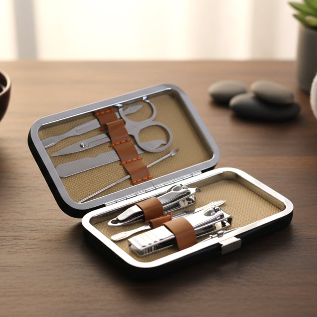 Maintain clean, well-shaped nails and a polished appearance with this 7 in 1 premium manicure and pedicure grooming kit. Designed for complete personal care, this compact set includes essential tools such as nail cutters, scissors, tweezers, nail file, cuticle tools, and cleaning accessories neatly organized inside a sturdy travel case. It helps you trim, shape, clean, and groom nails with precision and ease. The compact design makes it perfect for keeping at home, in office drawers, or inside your travel bag for quick grooming anytime. Suitable for both men and women, this all-in-one nail care kit ensures hygienic grooming and professional-level nail maintenance wherever you go.