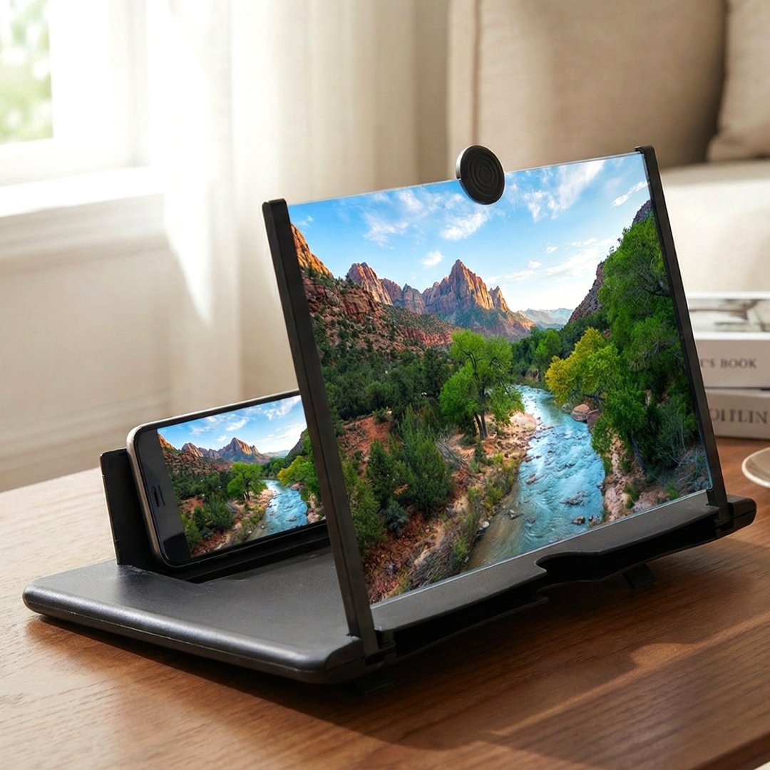 The foldable structure makes it easy to carry and store, while the sturdy base ensures stable placement on desks, tables, and bedside surfaces. It functions as both a mobile stand and a magnifier screen, allowing hands-free viewing at a comfortable angle. Perfect for home entertainment, office use, and travel, this portable screen expander provides a mini theater-like experience wherever you go.