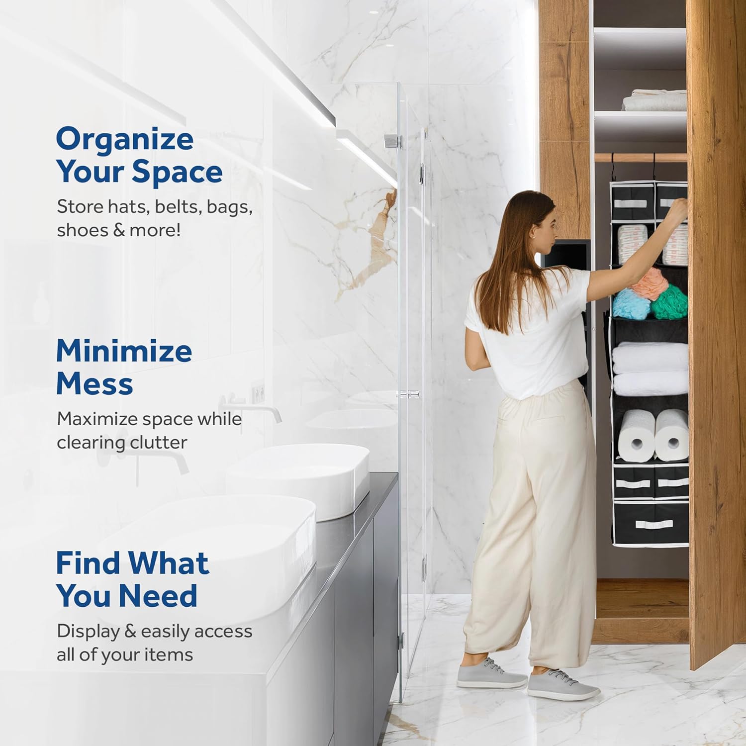 - EASILY ACCESSIBLE – 2 Hangers are attached to the top of the organizer, so it doesn’t swivel. The entire front of the organizer is open, exposing the contents for easy access. Bins slide smoothly in and out with the sturdy handgrips and can be removed and carried from room to room.