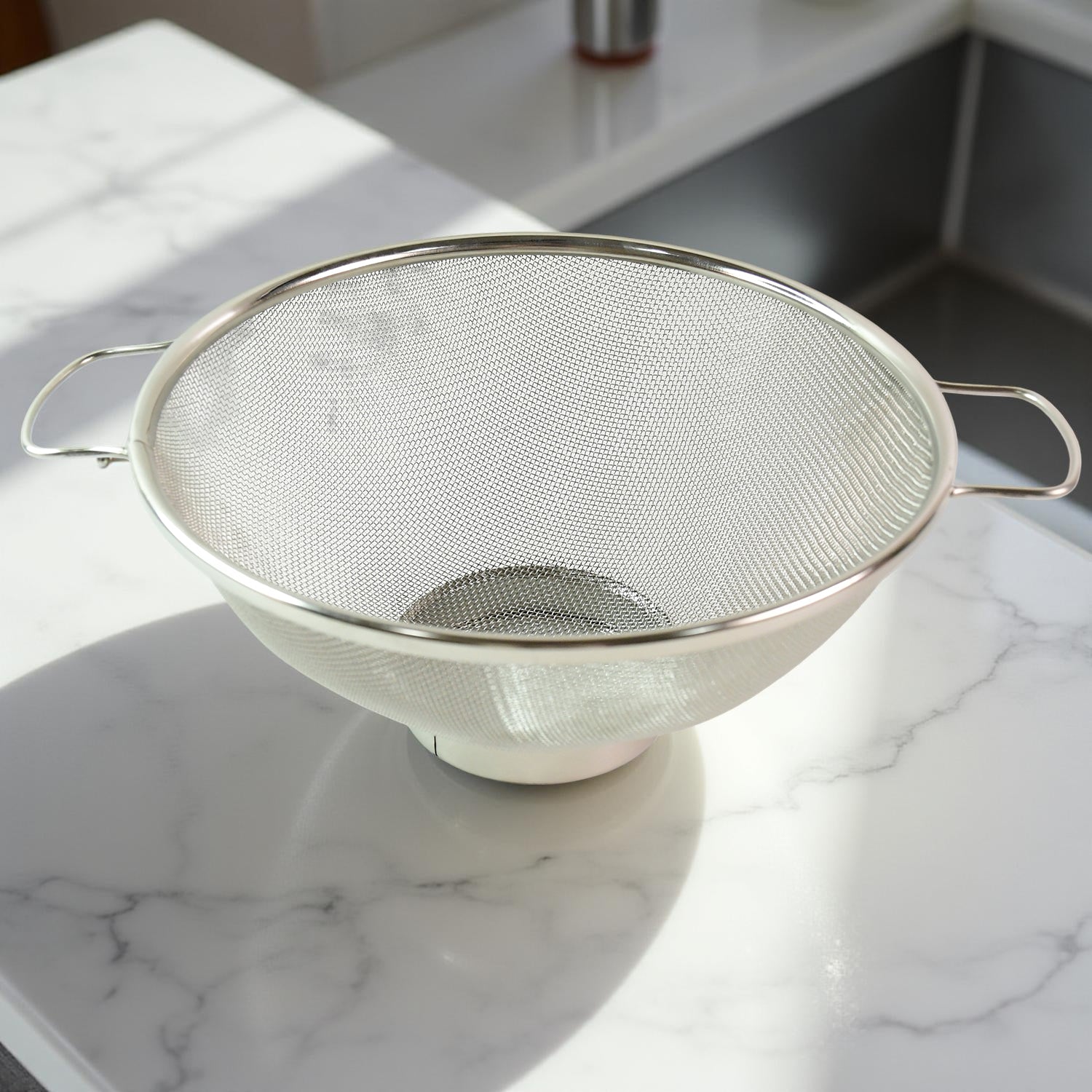 Fine Mesh Woven Design: Ideal for draining small grains, pasta, fruits, and vegetables without spillage.
