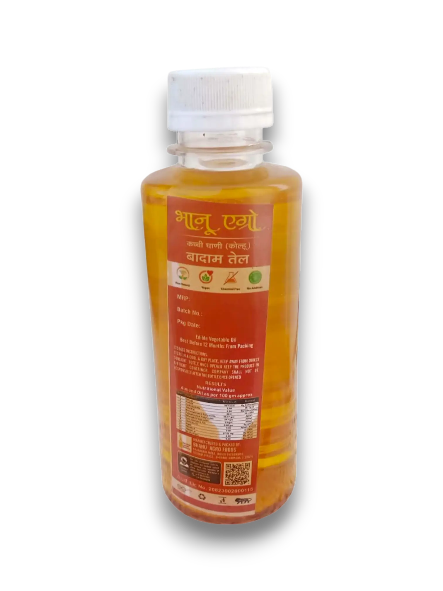 Bhanu Agro Almond Oil is traditionally wood-pressed to maintain maximum nutritional value. Every drop contains the full richness of premium almonds—making it ideal for hair, skin, and wellness.