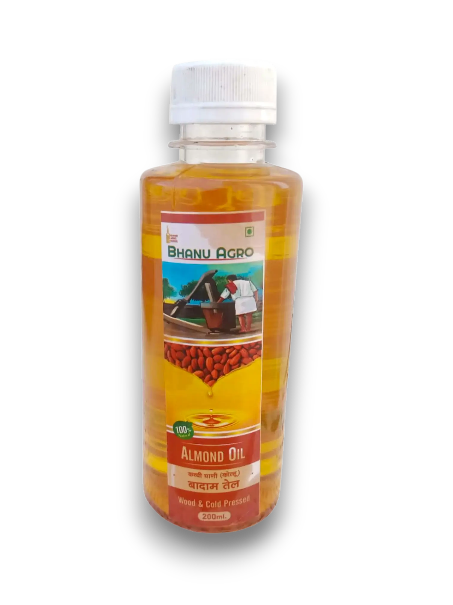 Bhanu Agro Almond Oil (200ML) is a premium-grade 100% pure, natural, wood & cold-pressed badam tel crafted to preserve the full nutritional value of almonds. Extracted using the traditional wooden churner (kolhu), this oil retains its authentic aroma, rich flavor, and dense nutrient profile.