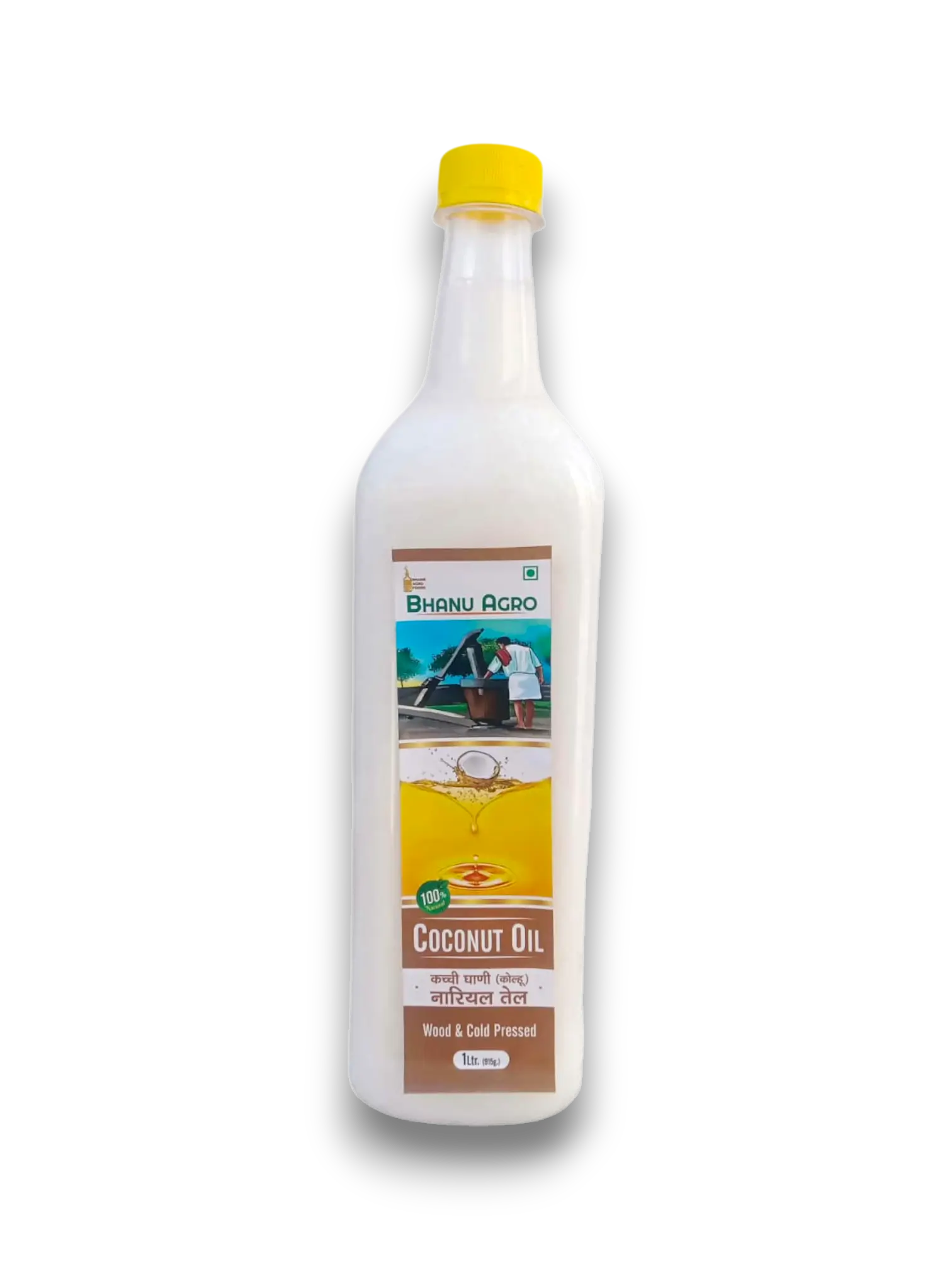Bhanu Agro Coconut Oil (1000ML) is a premium-quality 100% pure, natural, wood & cold-pressed nariyal tel extracted using the traditional wooden churner (kolhu). This process ensures that the oil retains all essential nutrients, antioxidants, natural aroma, and purity—making it superior to refined or chemically processed coconut oils.