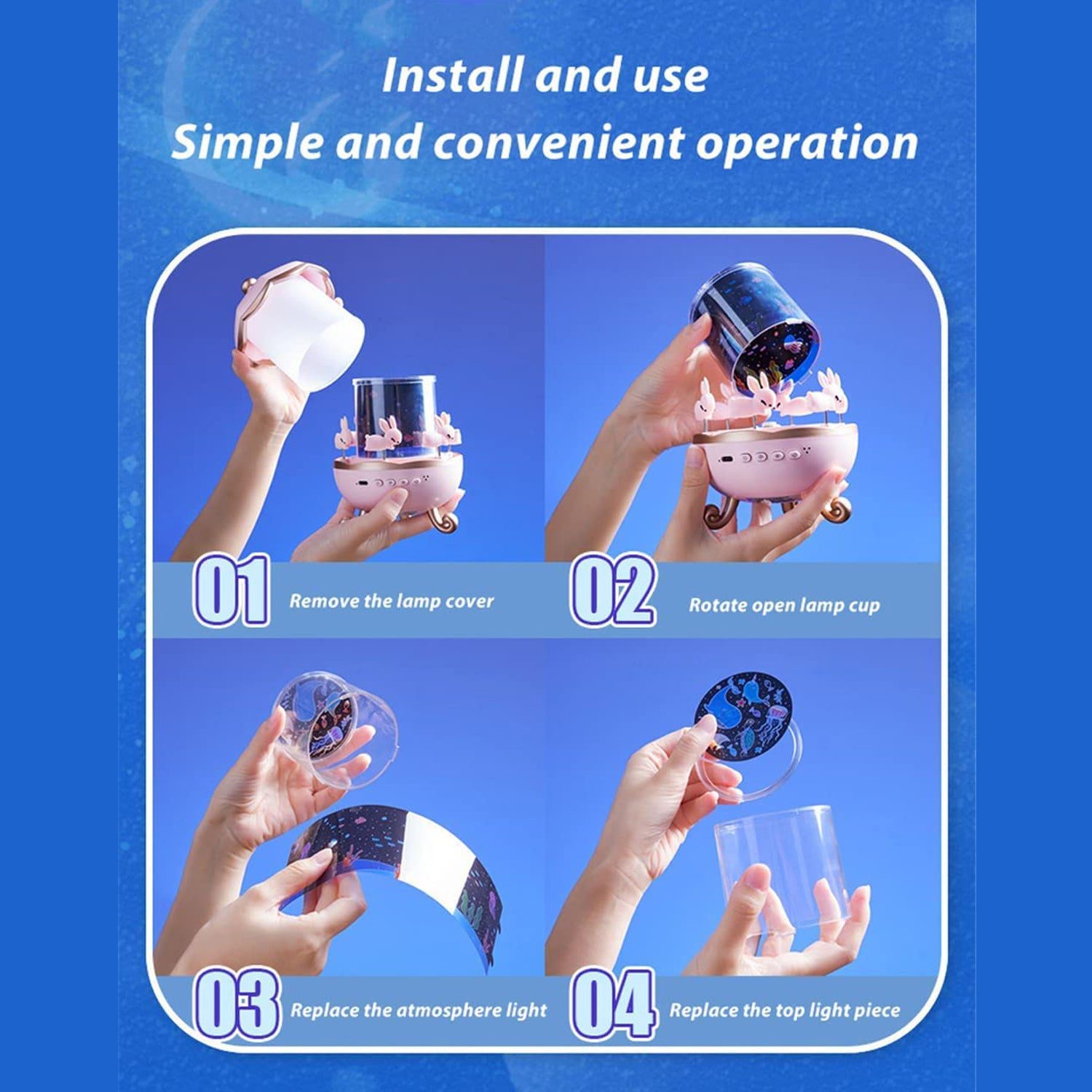 Grab this Bunny Carousel LED Night Light! Features a 360° rotating design and soft glow, perfect for nurseries and children’s rooms. Order this cute lamp now!