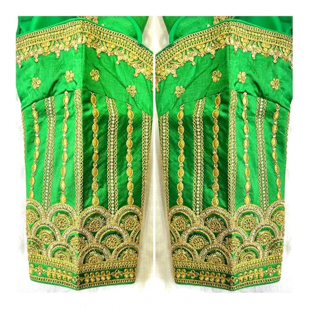 Elevate your ethnic style with this Premium Light Green Phantom Silk Embroidered Readymade Blouse. Featuring intricate detailing on a comfortable round neck and short sleeves, this free-size blouse is perfect for festive occasions and easily pairs with various sarees. Shop now for a touch of elegance and convenience.