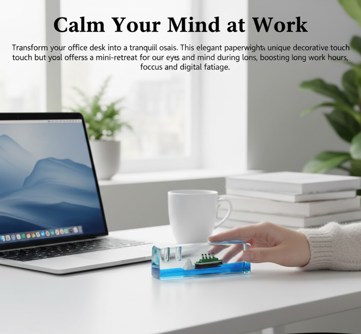 • This desk toy has a clear exterior and the inside is filled with soothing blue liquid, a floating titanic and an iceberg. You can gently tilt the paperweight to experience a soothing, stress relieving experience. Great for providing relief for kids and adults who suffer from anxiety.