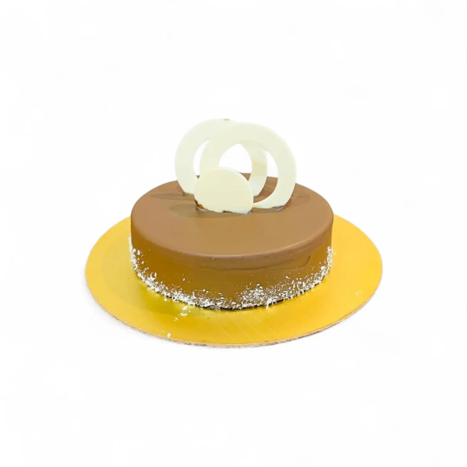 🎂 Refined design featuring interlocking white chocolate loops and coconut flakes, suited for elegant occasions