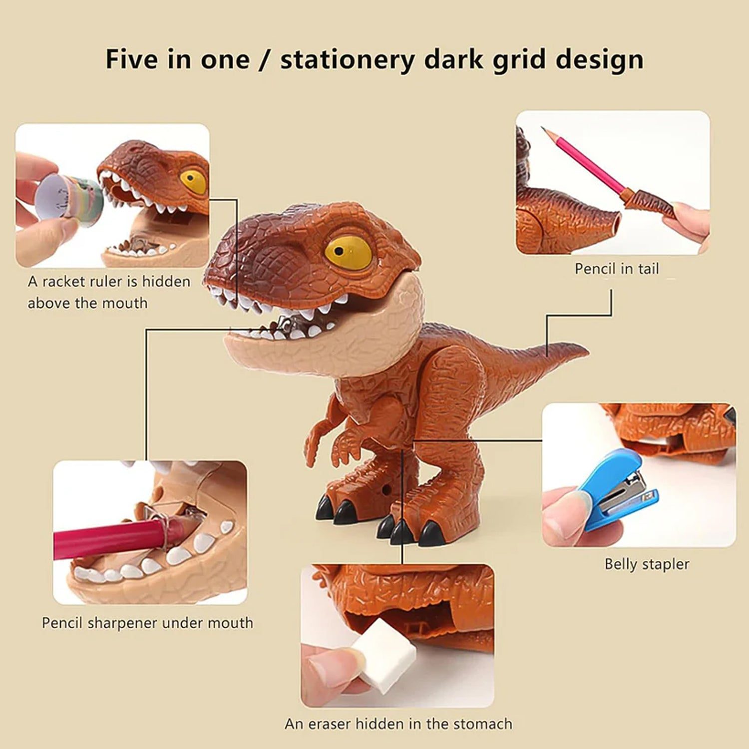 5-in-1 Stationery Kit: Includes Pencil, Dinosaur Sharpener, Stapler, Eraser, and Scale.