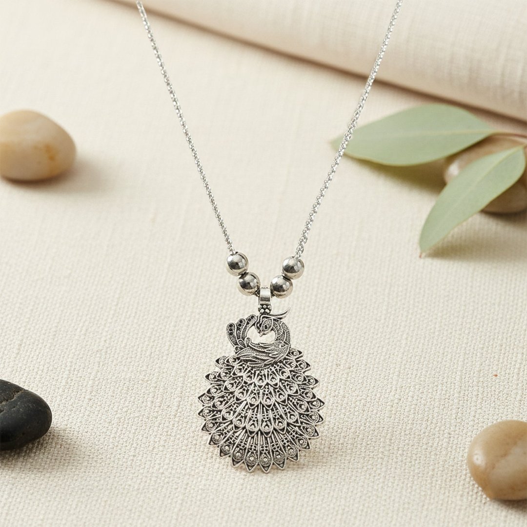 Elegant Peacock Design Oxidised Silver Finish Pendant Necklace (1 Pc)