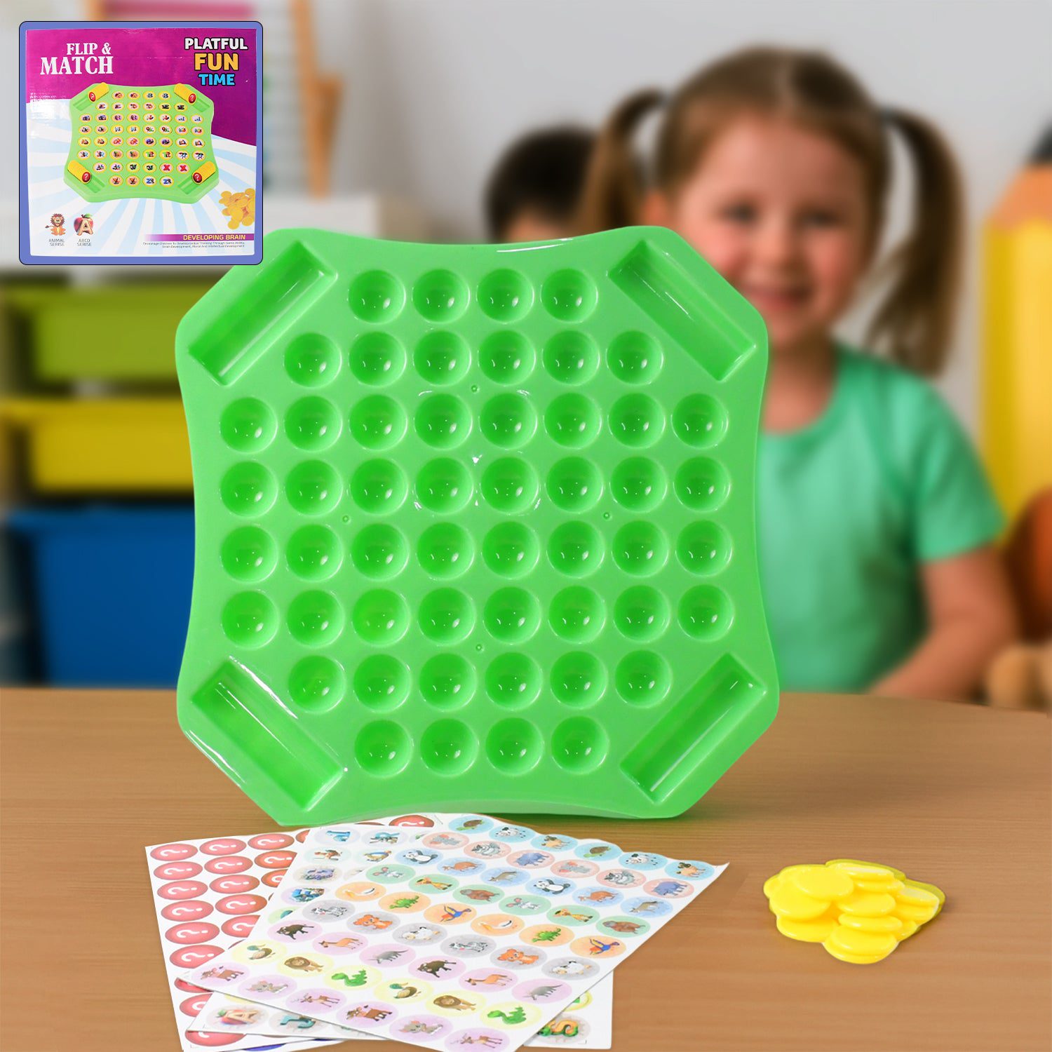The Flip & Match Educational Puzzle Game is an engaging and playful way for children to learn while having fun. This interactive toy set includes a colorful pop board, matching stickers, and game tokens designed to develop memory, concentration, and recognition skills in kids. By flipping and matching images, children can enjoy hours of entertainment while boosting their cognitive and motor skills. Made from durable, child-safe material, this game is perfect for group activities, classrooms, or family fun time at home. Its compact and lightweight design makes it easy to carry and store, ensuring non-stop playful learning for children.