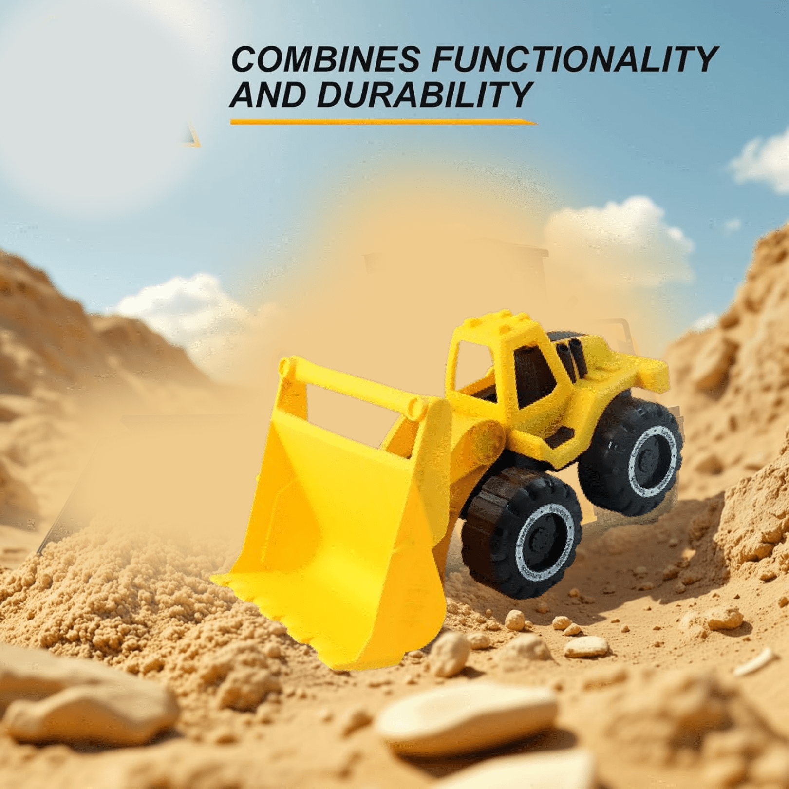 Fuel big imaginations with this Funwoods rugged front-loader toy engineered for classic push-and-play fun. Charge the friction wheels with a quick push and watch the truck roll ahead—no batteries, no switches. The wide, textured tyres grip floors and sand, while the large front bucket lifts and scoops for realistic construction play. Built from durable, child-friendly materials with smooth rounded edges, it stands up to daily tumbles and wipes clean in seconds. Perfect for pretend building sites, beach digs, and indoor play mats, this truck turns any corner into a work zone.