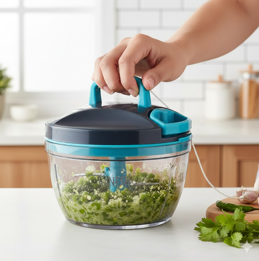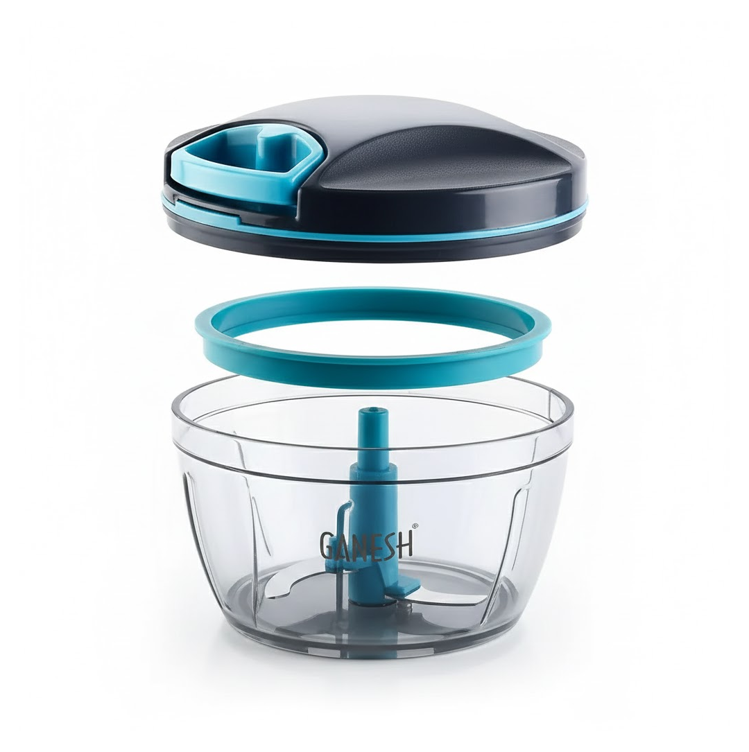 GANESH Wonder Chopper is Ideal for chopping and cutting onion, vegetables, dry fruits, nuts, herbs, etc. It has Sturdy Stainless Steel Blades for quick and efficient chopping. It provide Tear Free Chopping for Onions, Garlic, Chilly, Etc. Make it instant-Paste, Chopping, Gravy, Salad, Chutney, Food Preparations, etc. using Wonder Chopper. Easy to Clean and Disassemble. Wonder Chopper is made From Food grade BPA free Virgin Material. No Electricity required. Four Safe lid locks ensures Safety during use. It has Non-skid base. It gives about More Than 380 Knife Cuts in less than 20 Sec. It Cuts and Chops with easy hand pull Cord function. Use and Care : Take the Chopper Container and Fix blade holder in the Centre. Cut the ingredient in to appropriate size and add evenly around the blade. Don’t Fill the bowl more than 3/4 of bowl Capacity. Close the Container with Chopper lid and Make Sure it is locked Securely. Pull handle Parallel to bowl. Sharp blades handle with Care. Keep out of the reach of Children.