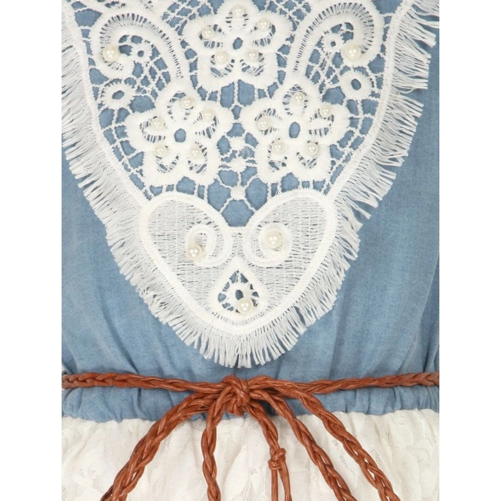 Generic Girl’s Denim Embroidery Short Sleeve Round Neck Dress (White)