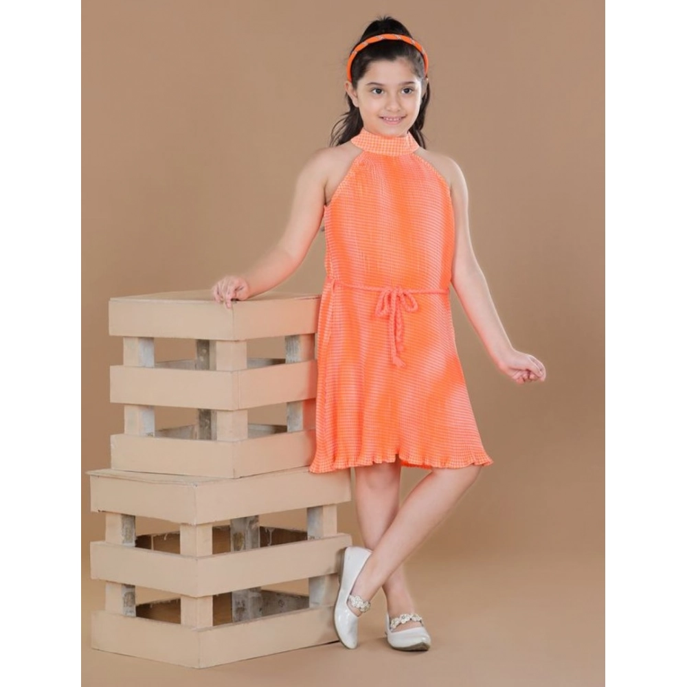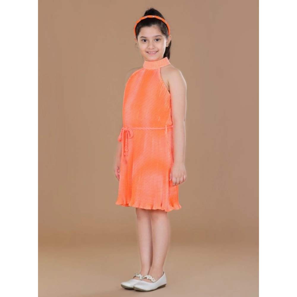 Generic Girl’s Polyester Crepe Printed Sleeveless Round Neck Dress (Orange)