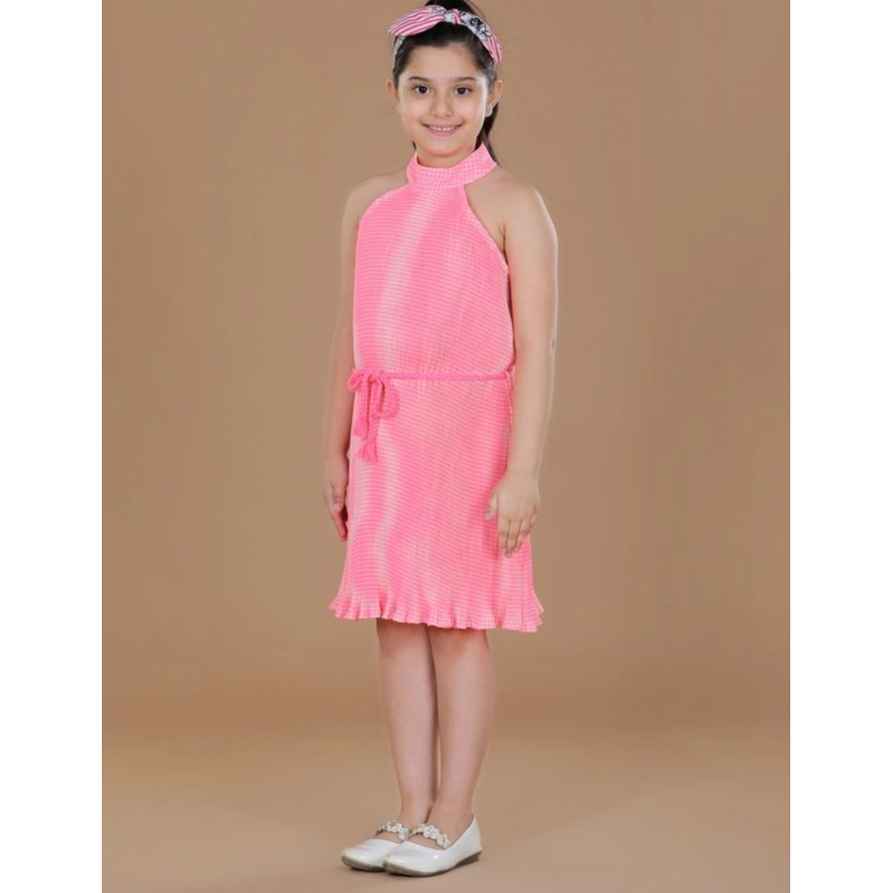 Generic Girl’s Polyester Crepe Printed Sleeveless Round Neck Dress (Pink)