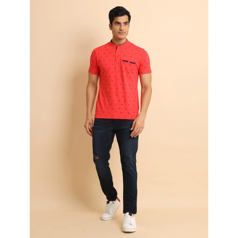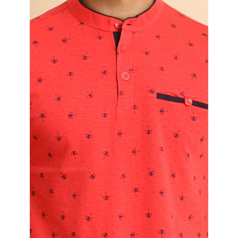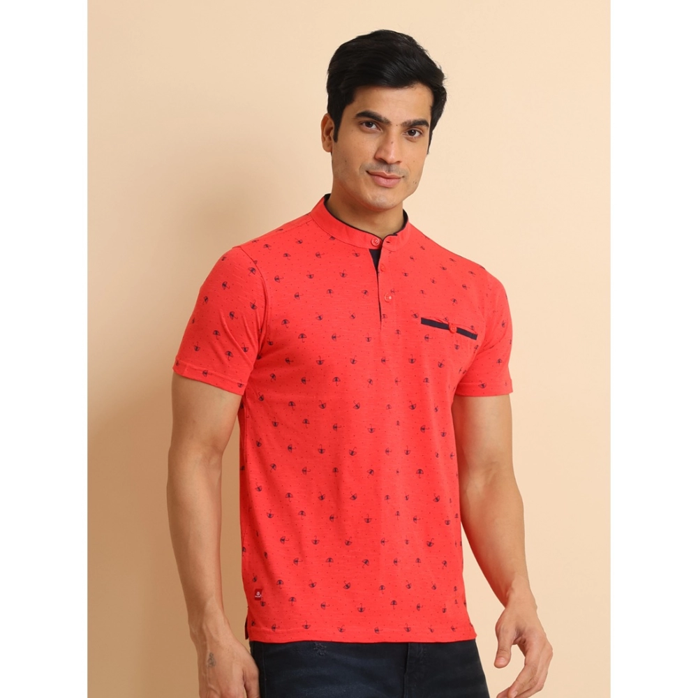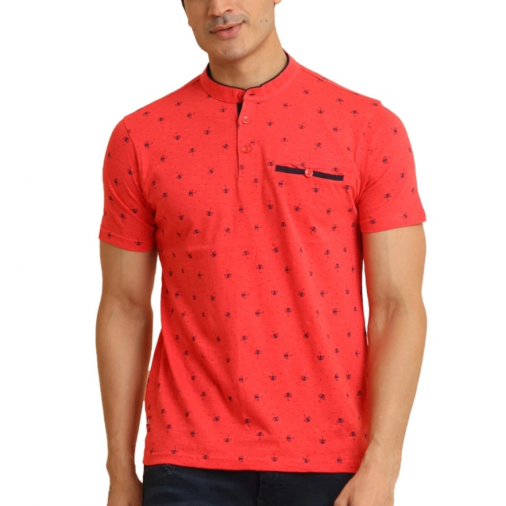 Generic Men’s Casual Cotton Printed Mandarin Collar Half Sleeve T-Shirt (Red)