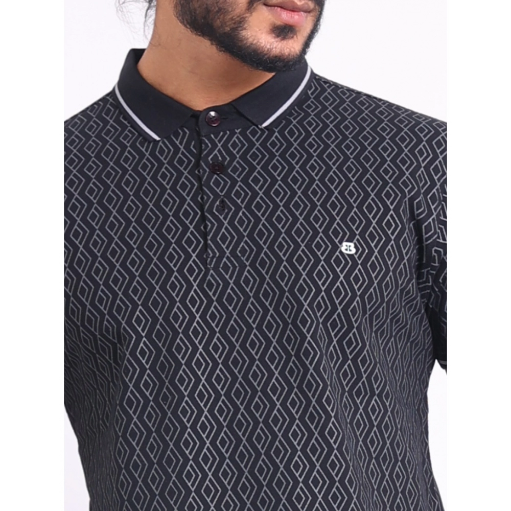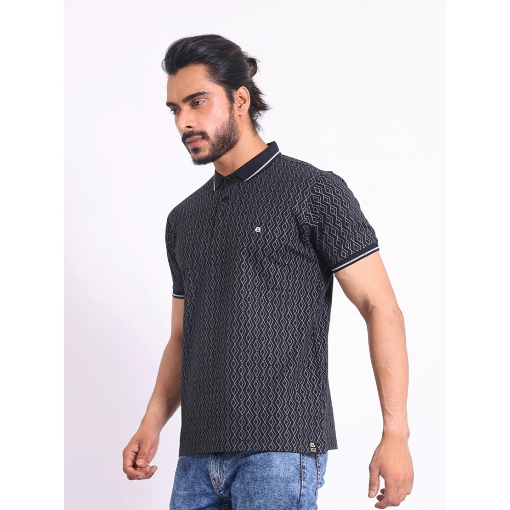 Generic Men’s Casual Cotton Printed Polo Neck Half Sleeve T-Shirt (Black)