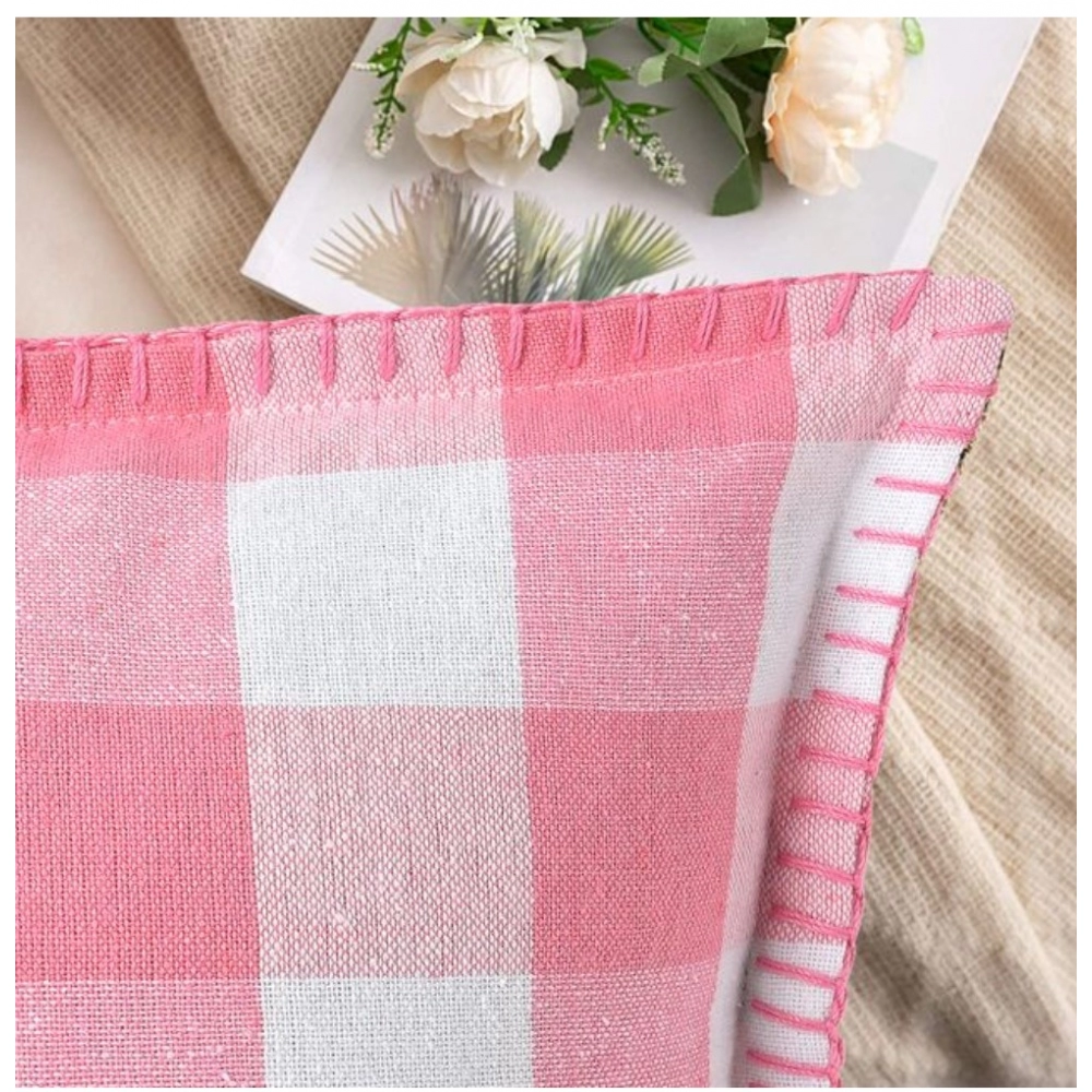 Generic Pack Of_2 Cotton Checkered Cushion Cover With Blanket Stitch (Baby Pink, Size: 12×20 In)