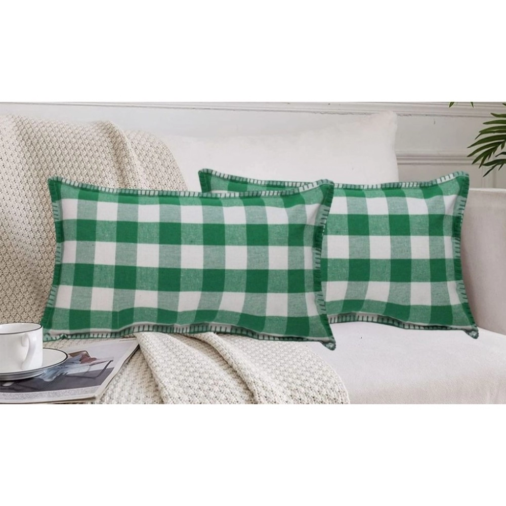 Generic Pack Of_2 Cotton Checkered Cushion Cover With Blanket Stitch (Green, Size: 12×20 In)
