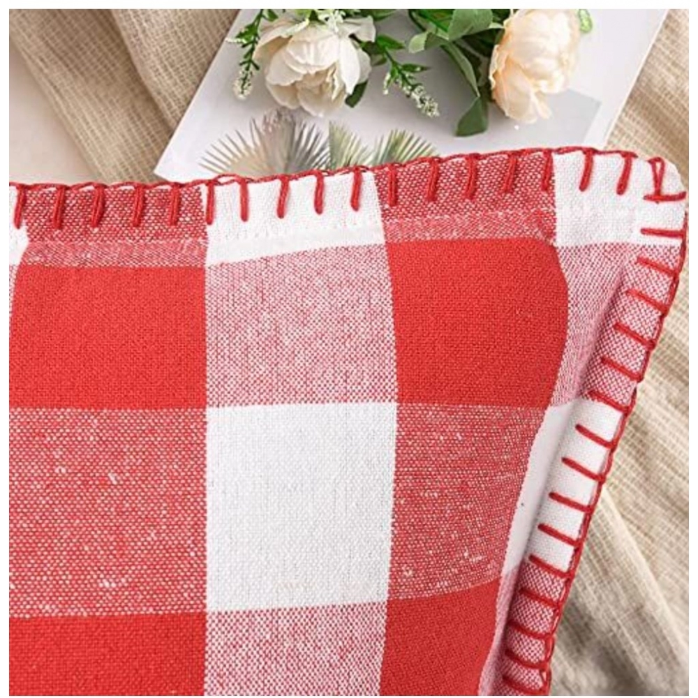 Generic Pack Of_2 Cotton Checkered Cushion Cover With Blanket Stitch (Red, Size: 18×18 In)