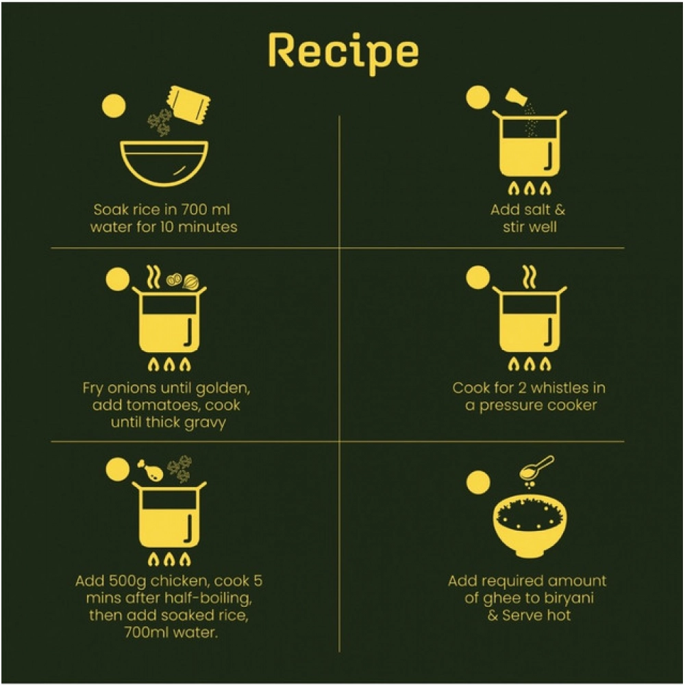 Ingredients: Seera Samba Rice, Kashmiri Chilli, Black Pepper, Salt, Turmeric, Coriander Powder, Onion Powder, Ginger Powder, Garlic Powder, Cassia Powder, Cardmon Powder, Refined Sunflower, Oil,