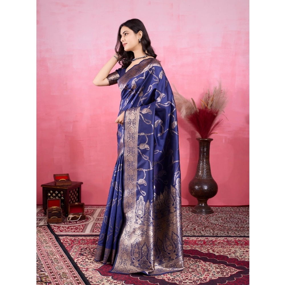 Generic Women’s Banarasi Silk Printed Saree With Unstitched Blouse 5.5Mtr (Blue)