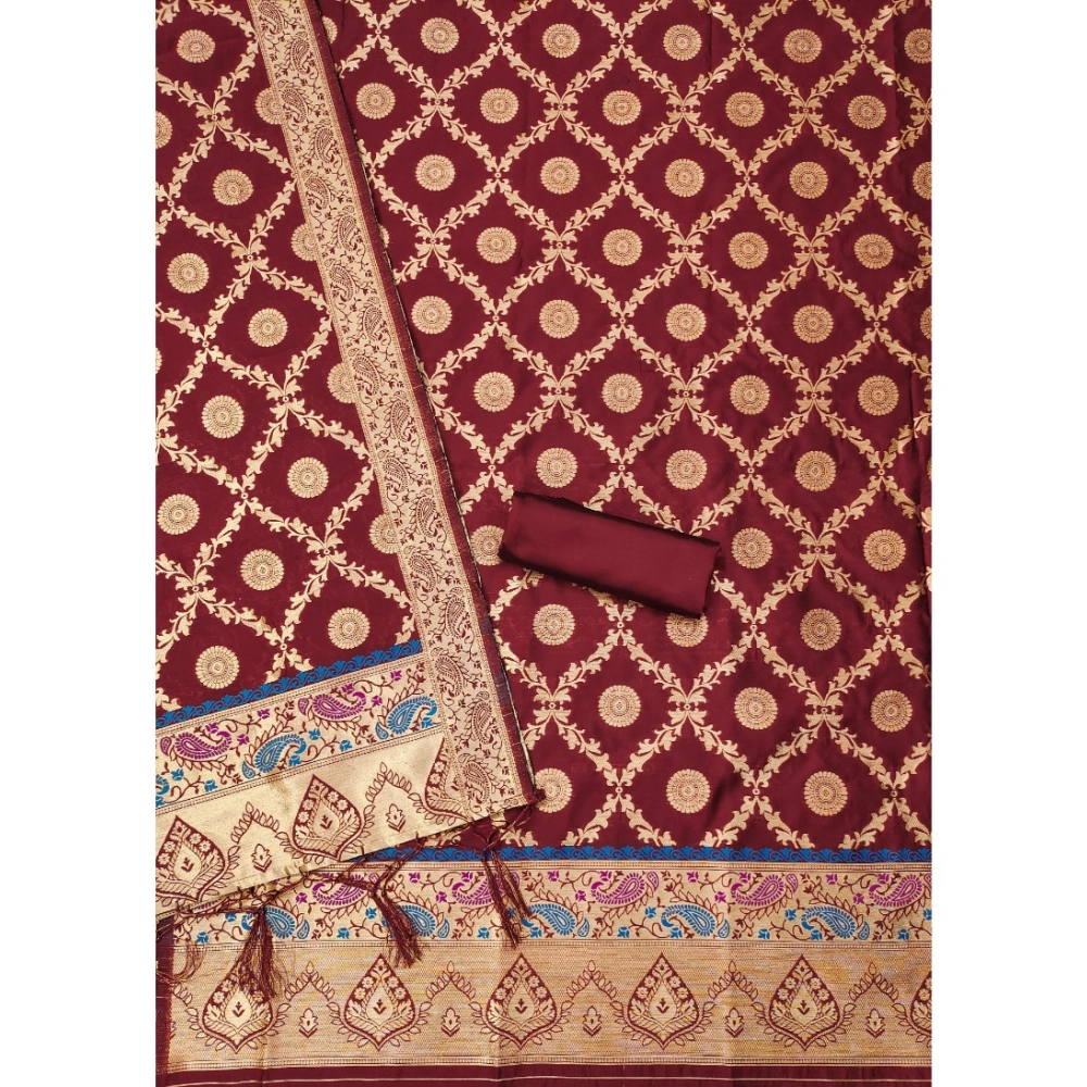 Generic Women’s Banarasi Silk Printed Unstitched Salwar Suit Material With Dupatta (Maroon, 3Mtrs)