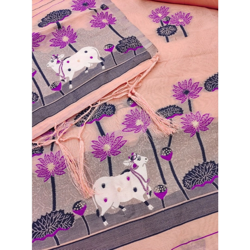 Generic Women’s Banarasi Silk Printed Unstitched Salwar Suit Material With Dupatta (Peach, 3Mtrs)