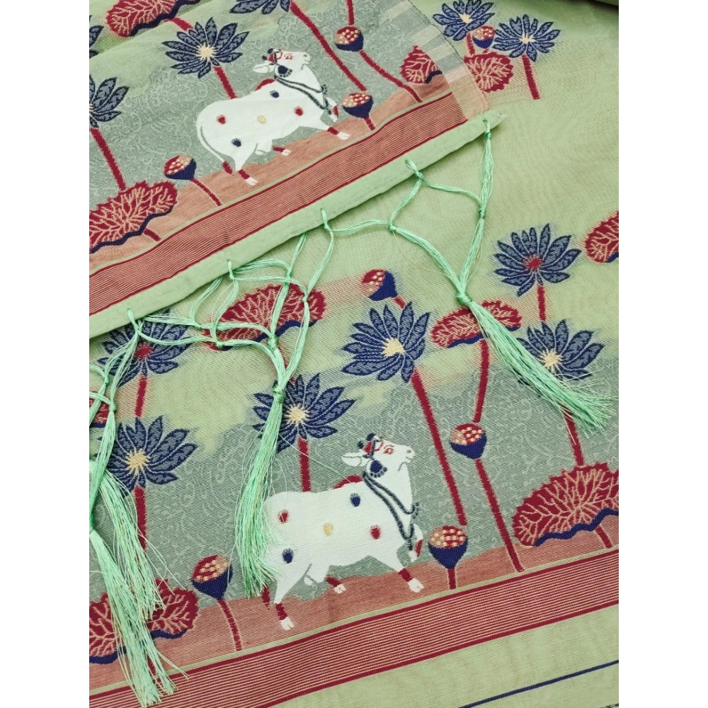 Generic Women’s Banarasi Silk Printed Unstitched Salwar Suit Material With Dupatta (Pista, 3Mtrs)