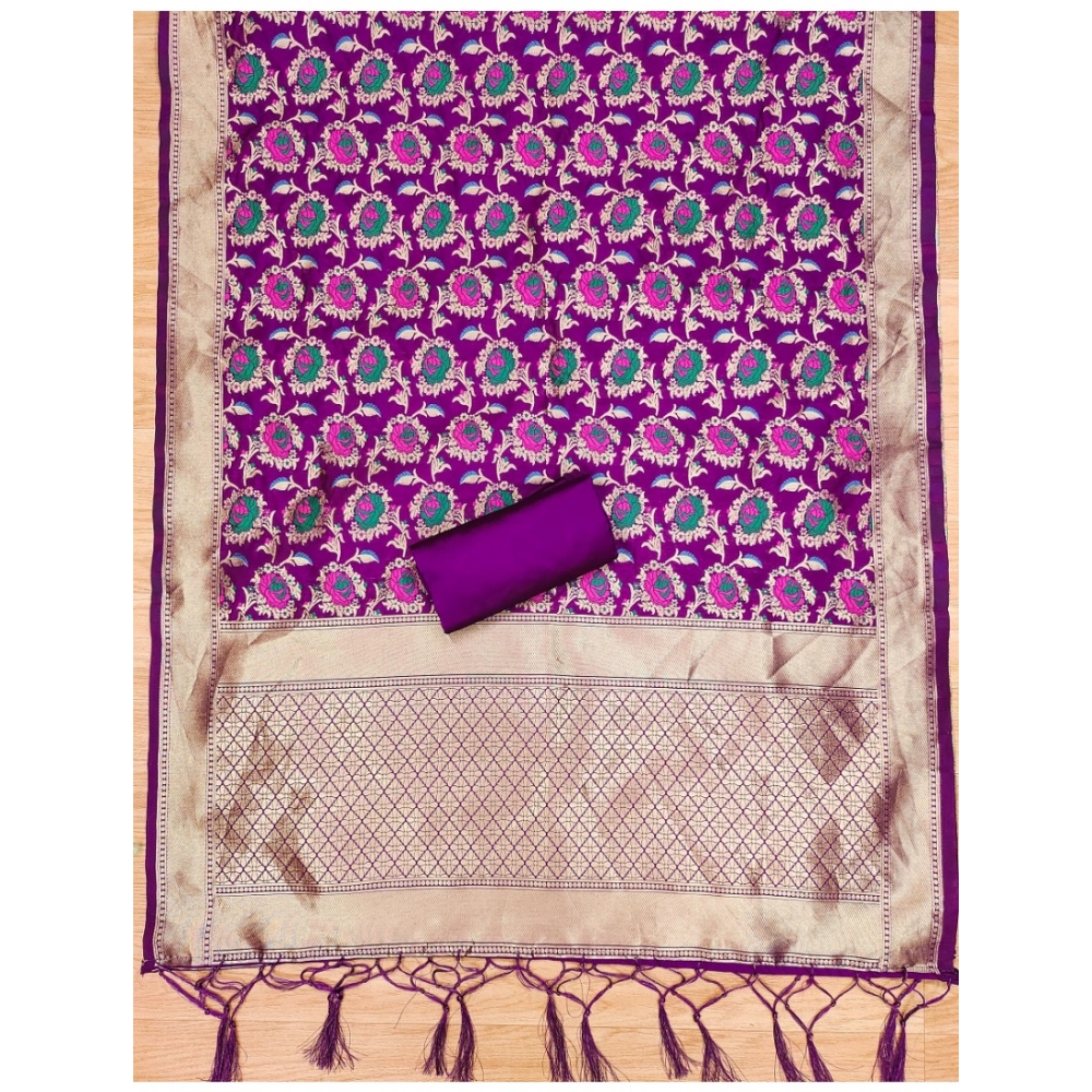 Generic Women’s Banarasi Silk Printed Unstitched Salwar Suit Material With Dupatta (Purple, 3Mtrs)