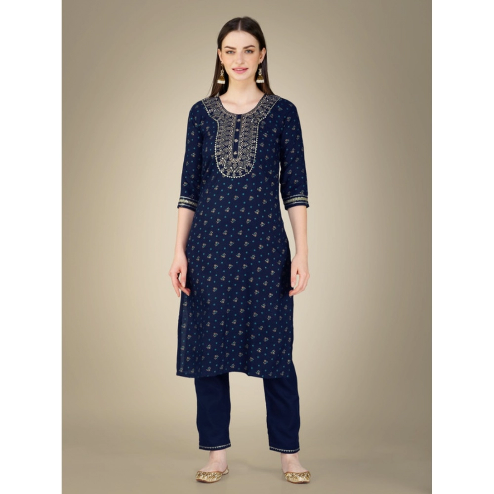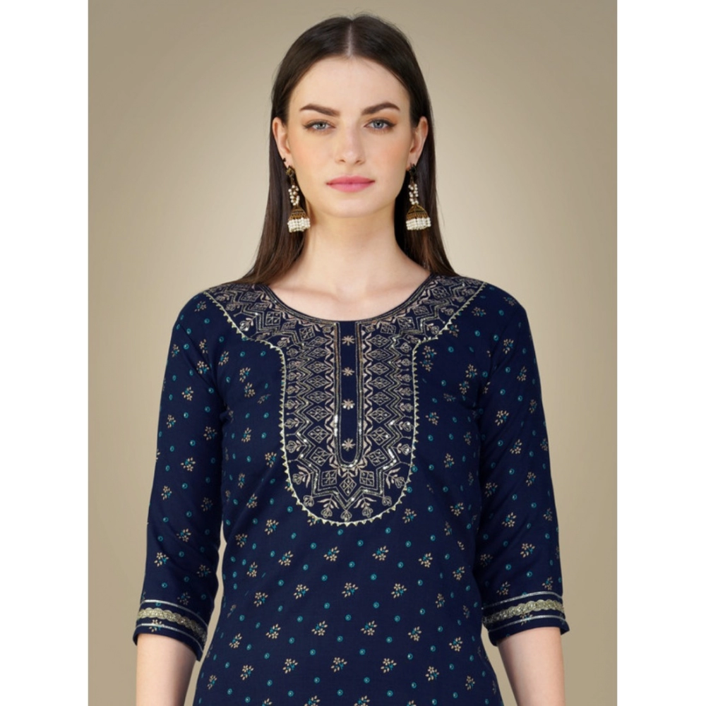 Generic Women’s Casual 3-4 th Sleeve Embroidery Cotton Kurti Pant Dupatta Set (Dark Blue)