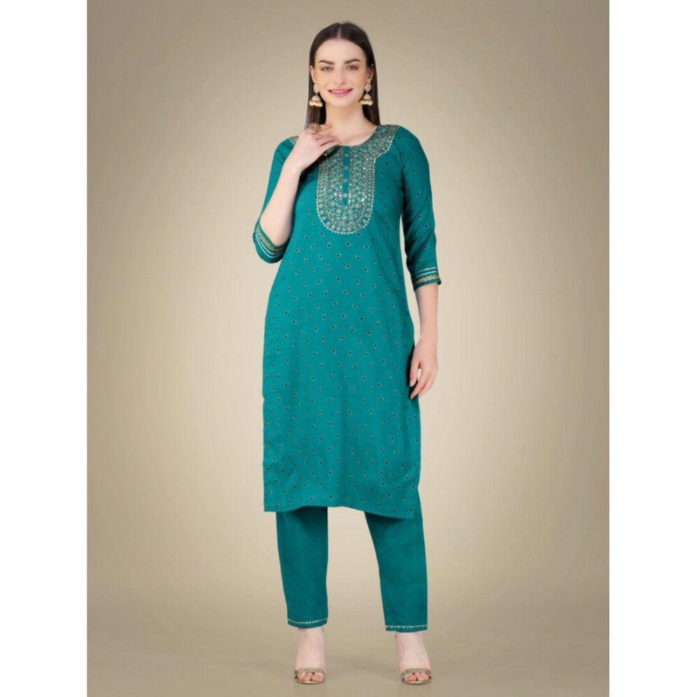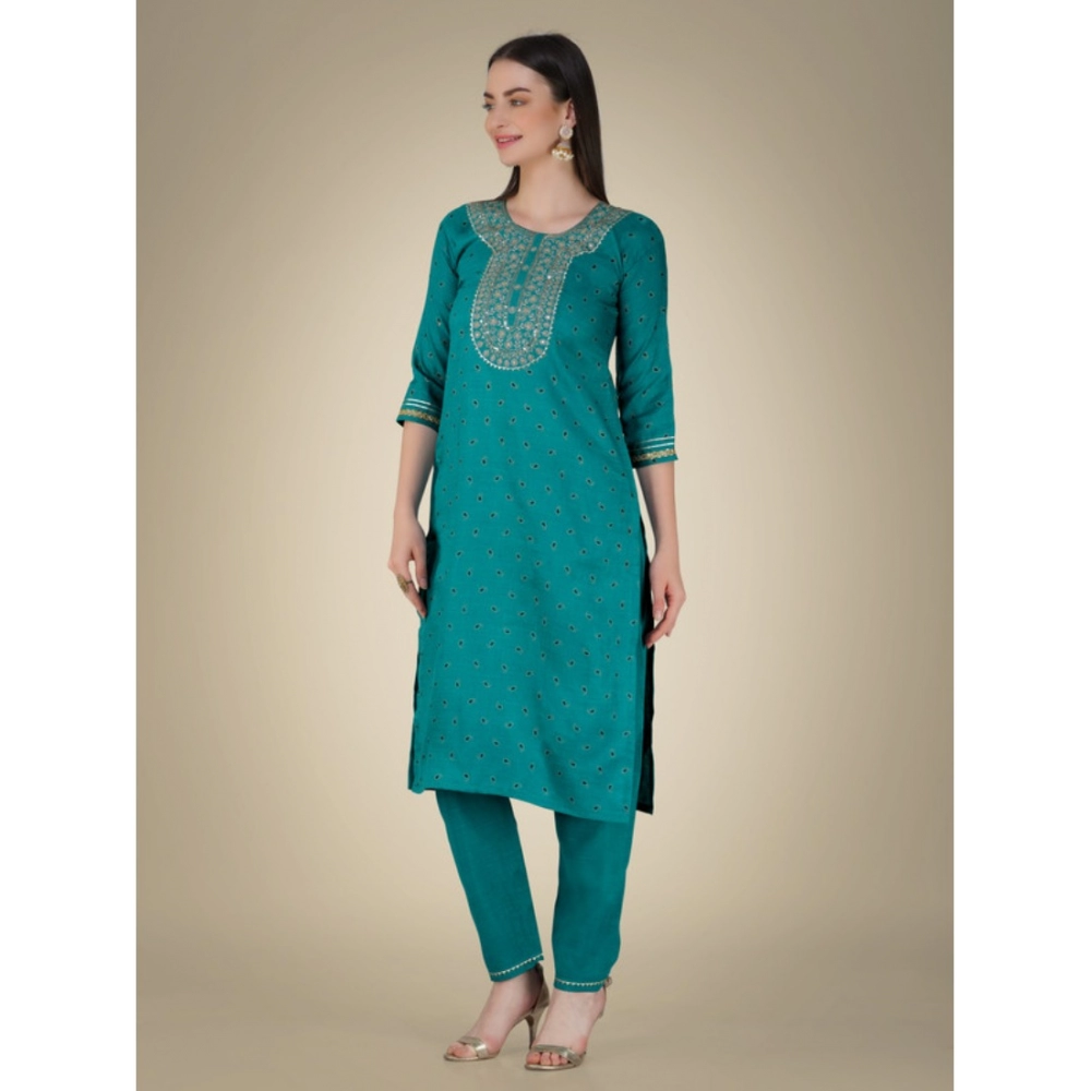 Generic Women’s Casual 3-4 th Sleeve Embroidery Cotton Kurti Pant Dupatta Set (Light Green)