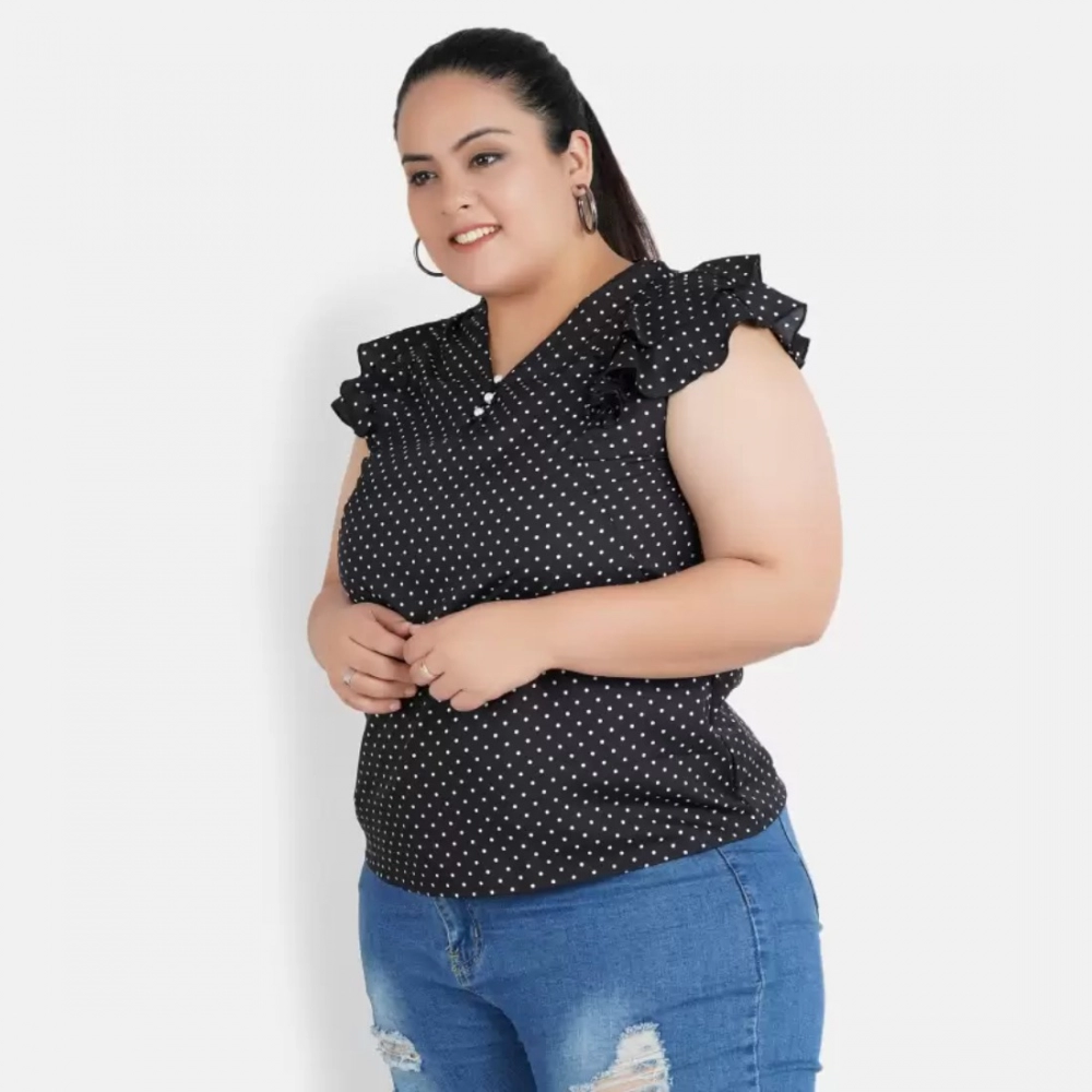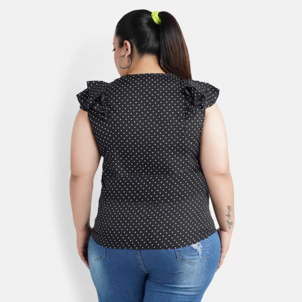 Generic Women’s Casual Flutter Sleeve Polka Print Black Top (Color:Black, Material:Crepe)