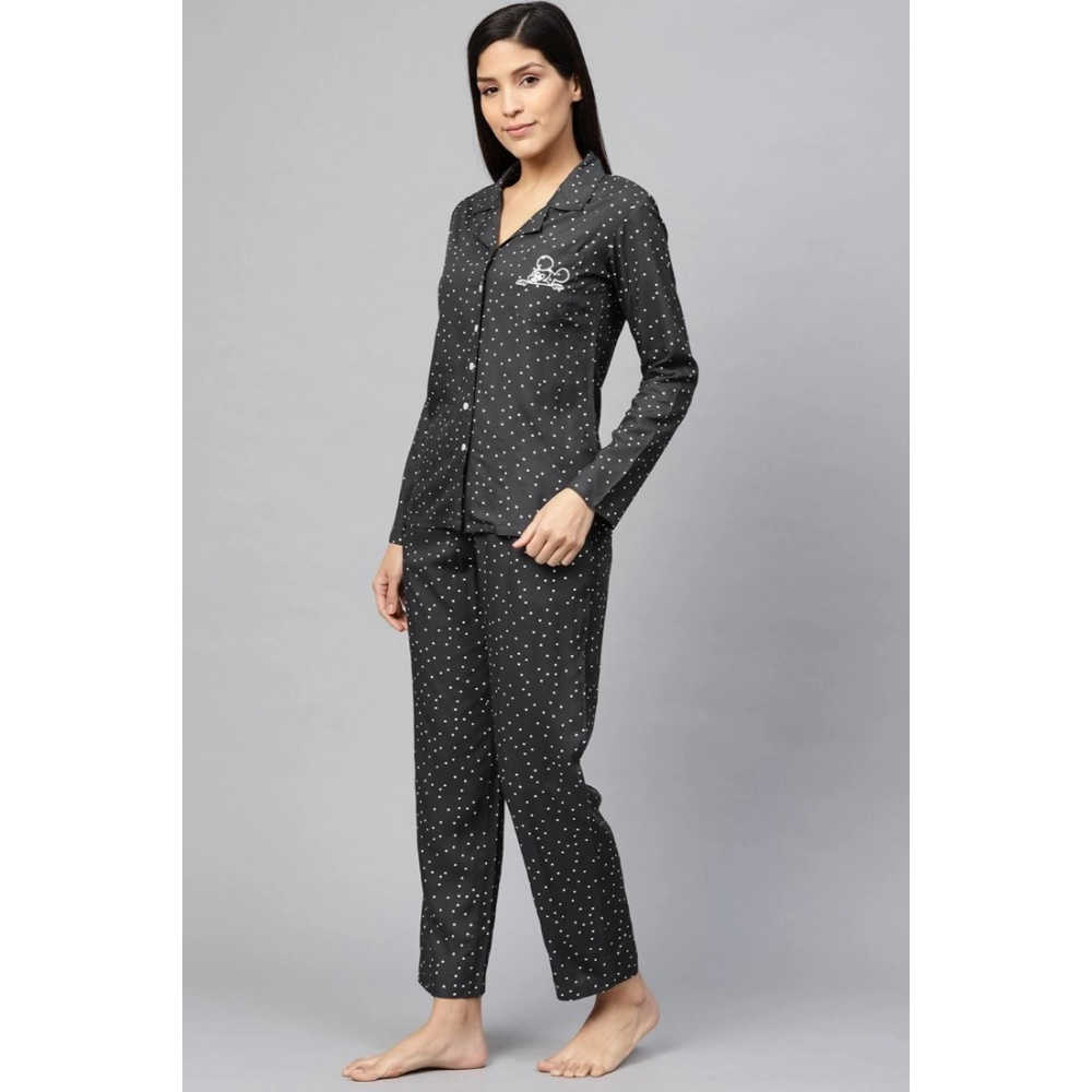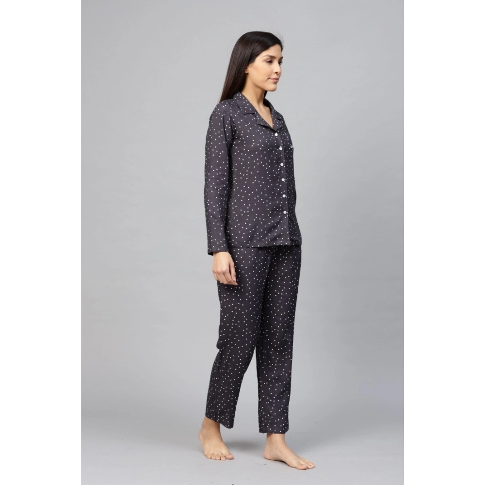 Generic Women’s Casual Full Sleeves Polka Dot Printed Rayon Shirt With Pyjama Pant Night Suit Set (Grey)