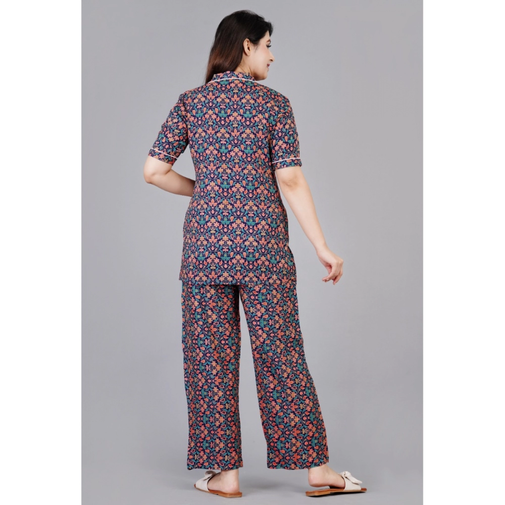 Generic Women’s Casual Half Sleeve Printed Viscose Rayon Shirt With Pyjama Pant Night Suit Set (Blue)