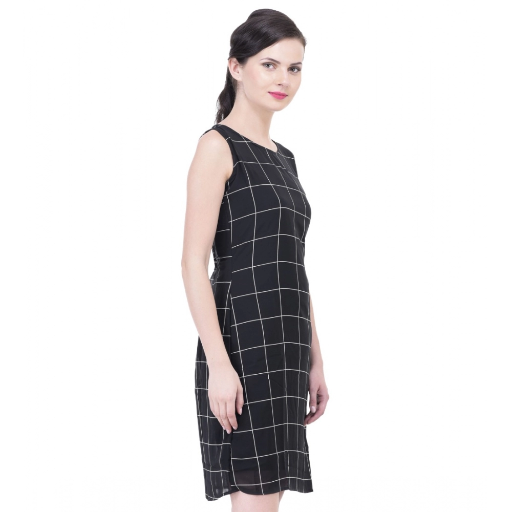 Generic Women’s Cotton Blend Checked Sleeveless Sheath Dress (Black)