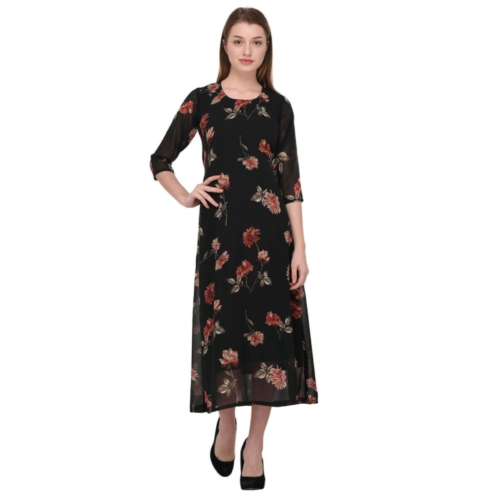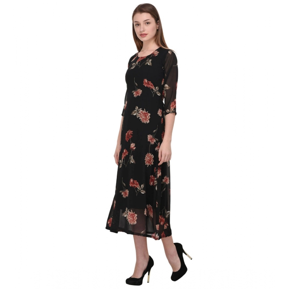 Generic Women’s Cotton Blend Floral 3-4 Sleeve Dress (Black)