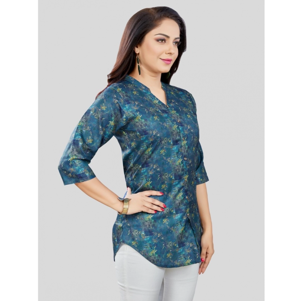 Generic Women’s Cotton Blend Mandarin Collar 3/4 Sleeves Short Top (Blue)